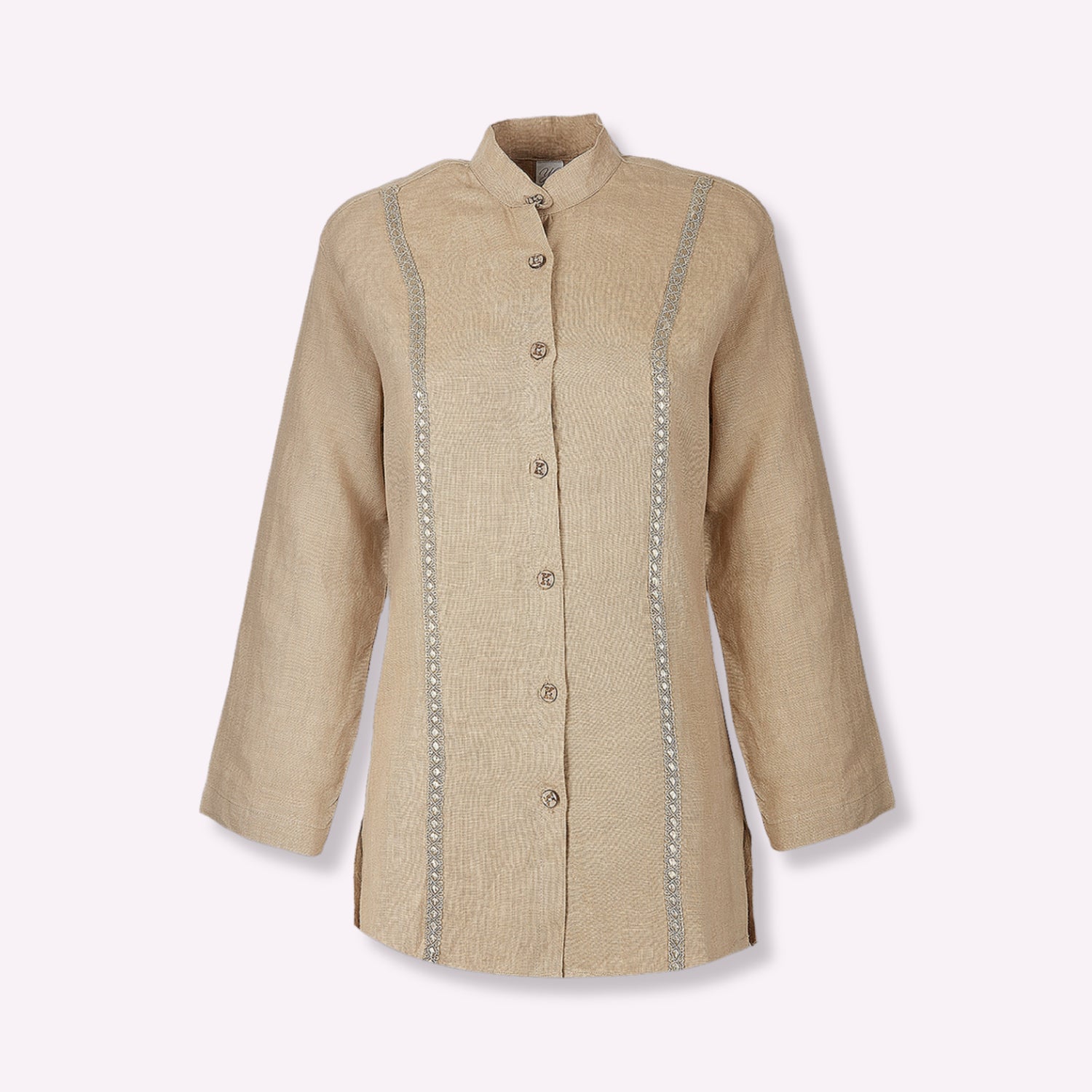 Chemisier en lin fait main "Stella" – Col officier et détails brodés – Beige Naturel